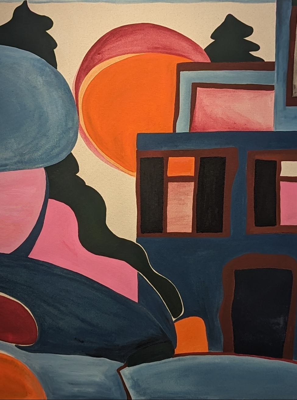 Die Arbeit Morgenrot über Mandal wurde 2024 mit Acryl auf Mischgewebe angefertigt, das Format beträgt 140 x 100 cm.